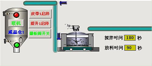 1、攪拌機可設攪拌時間和放料時間,達到時間自動打開閥門放料,達到放料時間自動關閉閥門,啟動皮帶機,打開計量斗放料。